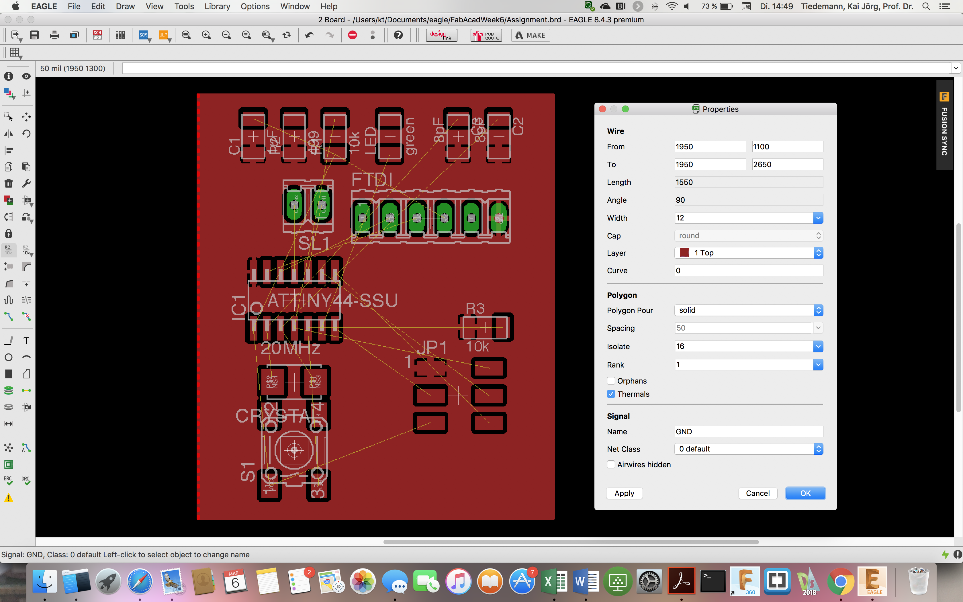 Switching to board view started with importing the components to the board (Figure 04). I picked a GND-plate configuration and a trace width of 16. However, the first layout displayed in Figure 05 was a poor arrangement that did not allow for proper connections. Many re-arrangements later, I finally found a satisfying solution displayed in Figure 06.