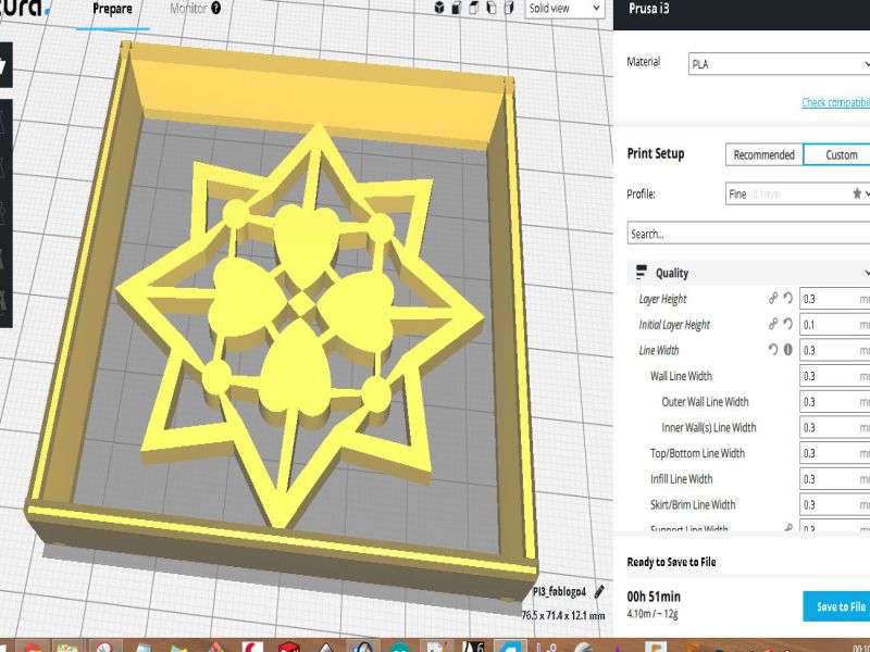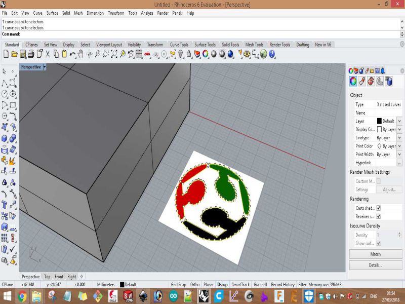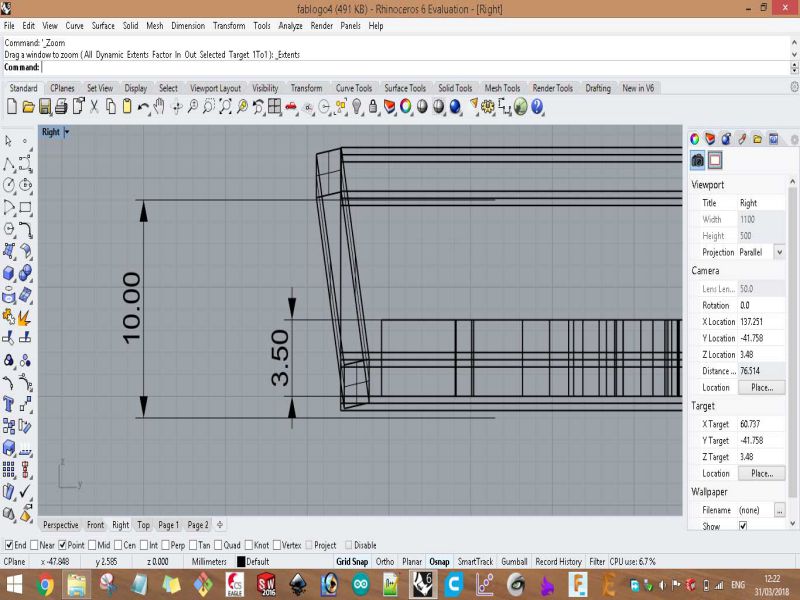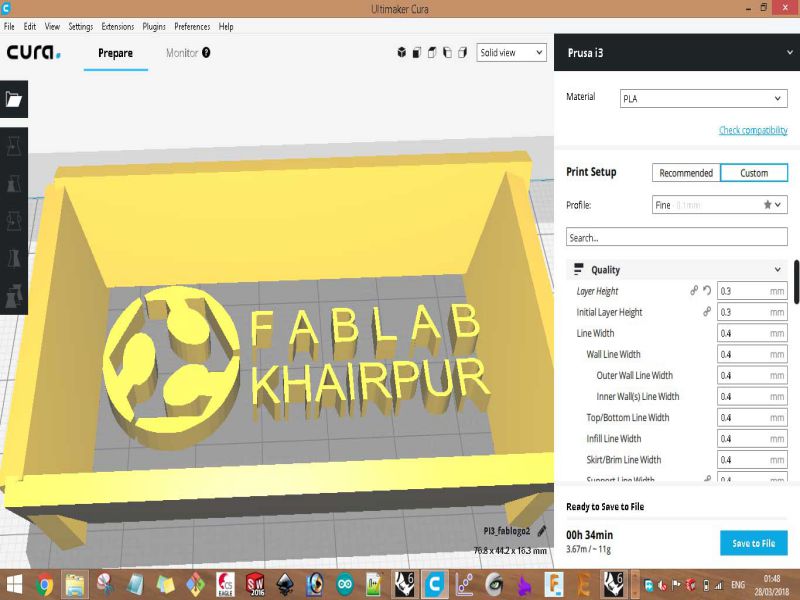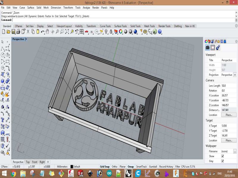 Again I decided to design the logo of our FabLab Khairpur for molding and casting. I import the 2D image of FabLab logo in "Rhino 3D" then following the line command I drew the boundaries of imported image and then I used extrudeCrv command to extrude it upto 3.75 mm up in z-axis. I used "text function" in "Rhino 3D" and wrote the text as "F A B L A B KHAIRPUR", again used line command, extrudeCrv command, and extrude the text upto 3.75 mm up in z-axis.