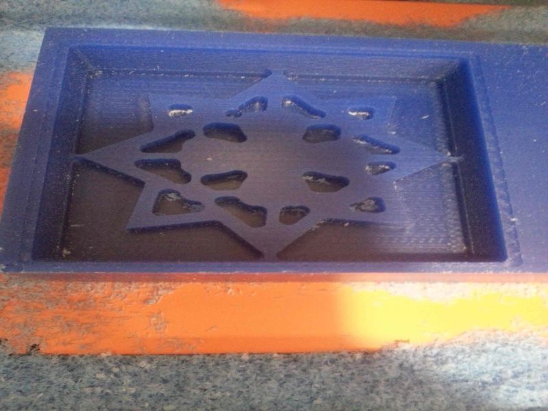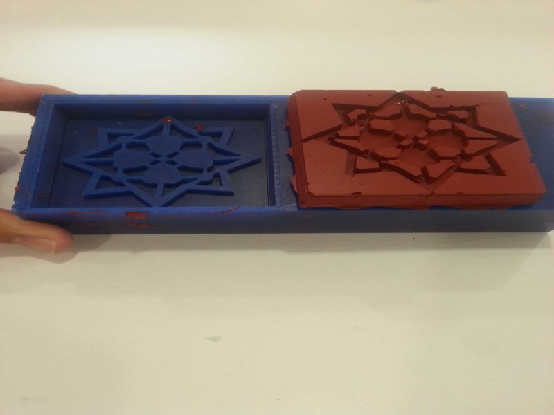 This was my mistake in designing the mold. I must increased the extra space where the edges of the design ends. So, by recovering this, I used cardboard walls for not flow the casting material from the design on silicon mold.