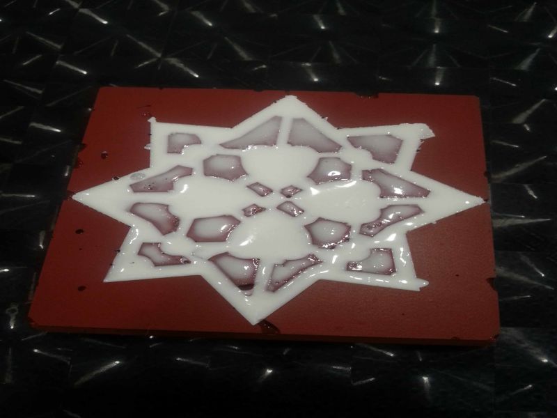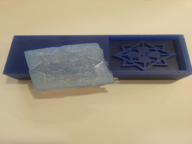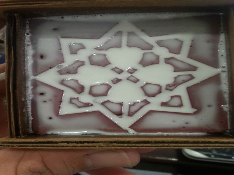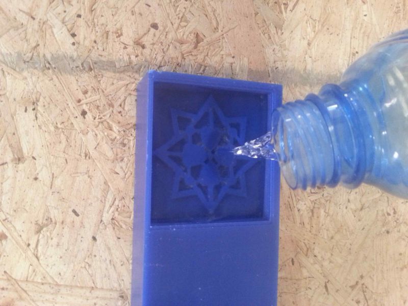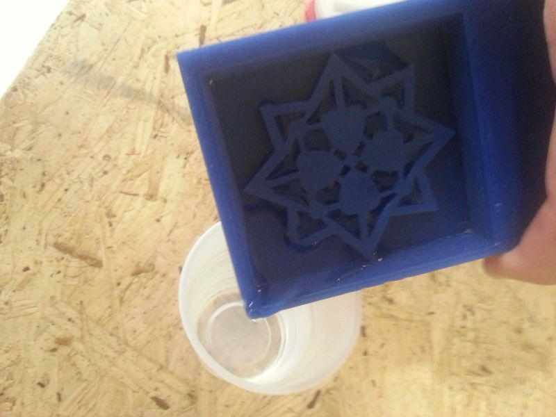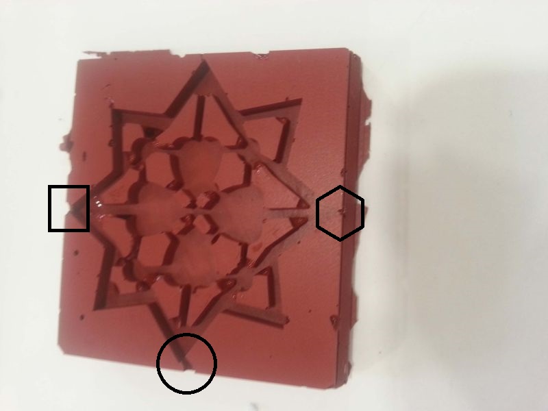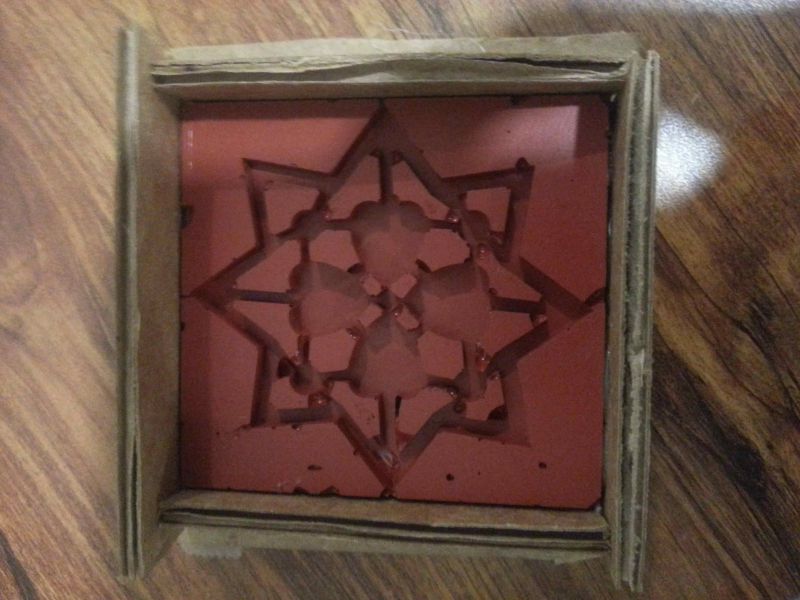 Here is the time for filling the silicon mold with final product's liquid material of casting. As, the liquid was thin, if I flow that liquid on the silicon mold then there was a chance of material to flow down through the edges of the design on mold. The corners of design from where there was a solid chance of liquid to flow out of the mold are shown in below image.