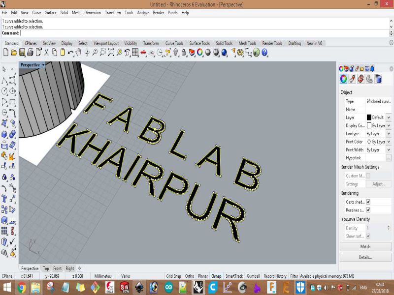 Following the line command on the text of FABLAB Khairpur, and then extrude it upto 3.75 mm using extrudeCrv command.