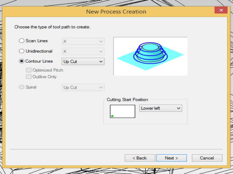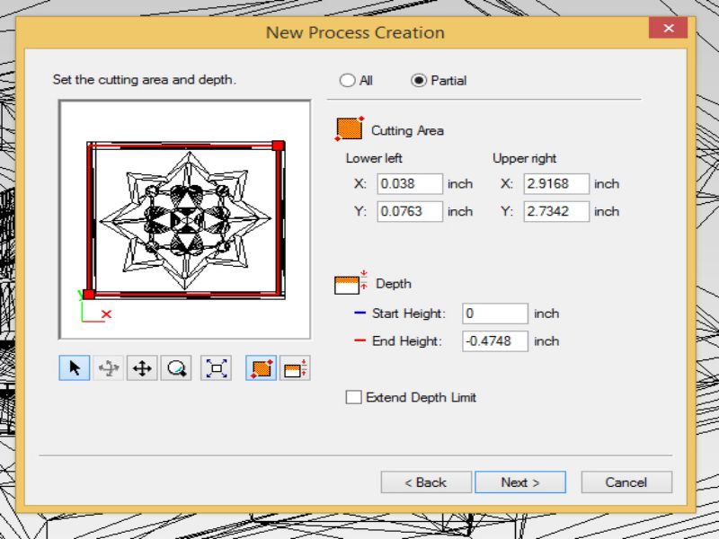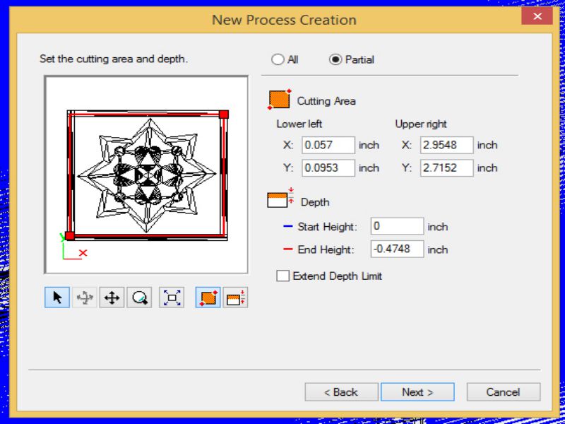 09. Check on 'Partial' then resize the red boundary line inside the box, then 'Next'.~~~~~ 10. Check on 'Contour Lines','Up Cut', then 'Next'.