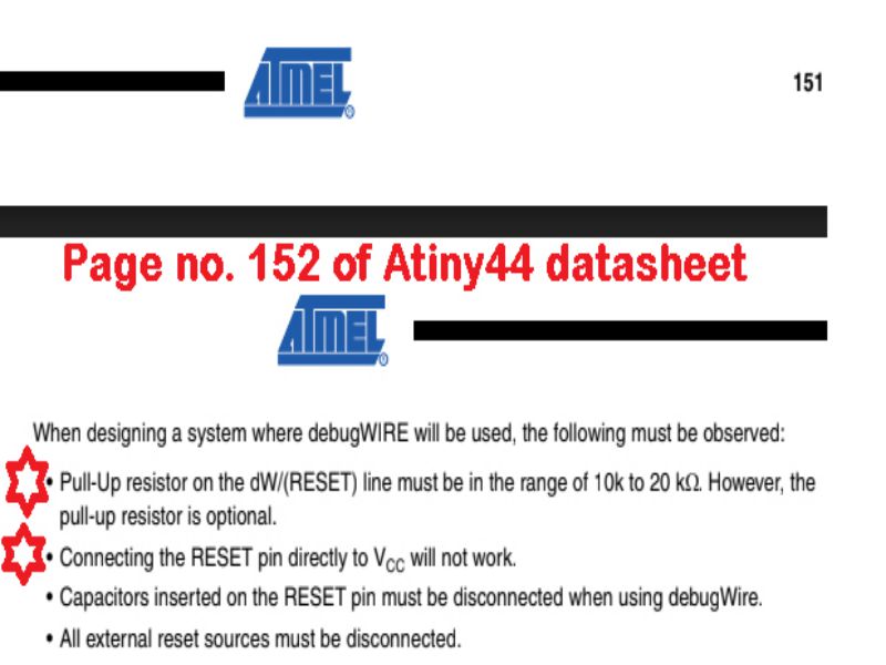 At reset pin (pin no.4 of attiny44), we have to use a pull up resistor of 10K to 20K ohm as mentioned in the datasheet of attiny44. I used 10K ohm value resistor for this purpose. Below snapshot is for further clarification about pull up resistor.