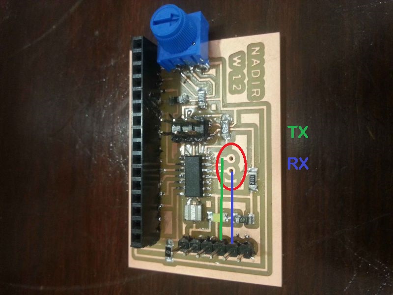 Rx /Tx: I did not connect pin no. 4 and 5 of FTDI connecter in week 12, because there was not use of these pins in that time. But here in this week these pins are in use, so by using jumper wires I connected pin no. 4 and 5 of the FTDI header, Rx and Tx respectively to the two unused pins of attiny 44 like pin no. 5 and 6 of the attiny44 IC. In week 12, I connect these two wire in a empty header for future use, so here is the use of these two pins.