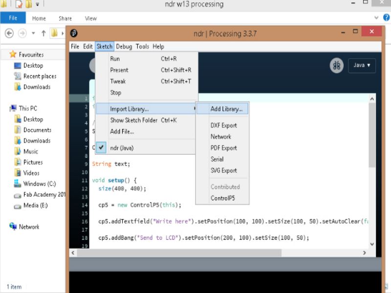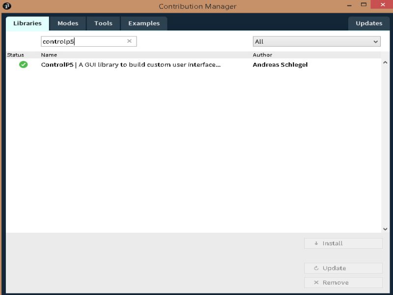 While playing above code, it needs including of library controlP5. So, go to Sketch, Import Library, Add library, then a windows will appear, there is a search box. Write controlP5 and install it.