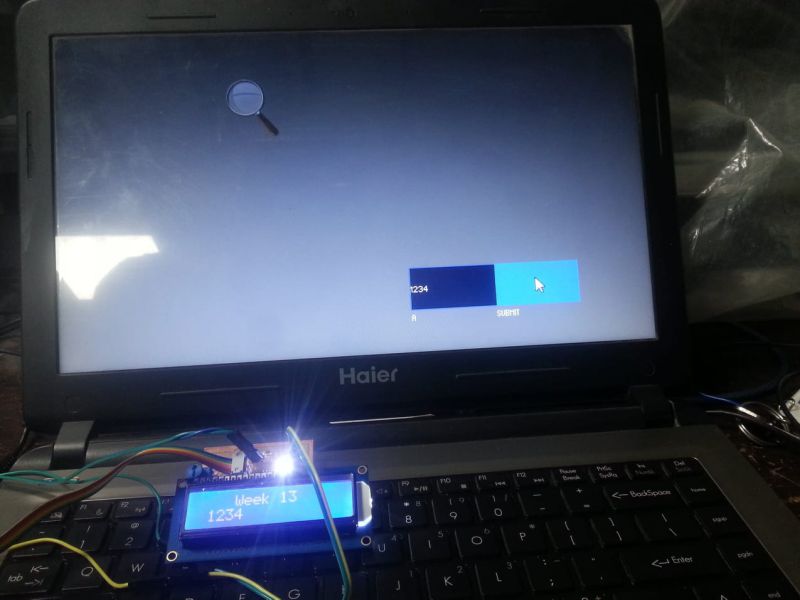 By playing code with valid port number and installing libraries and instaling them, here appears a window, where user types anything then that will display on LCD as it is. I typed digits 1 then play it, it appeared on LCD, then typed 2, then 3 and 4. These all typed digits appeared on LCD as shown in below photo.