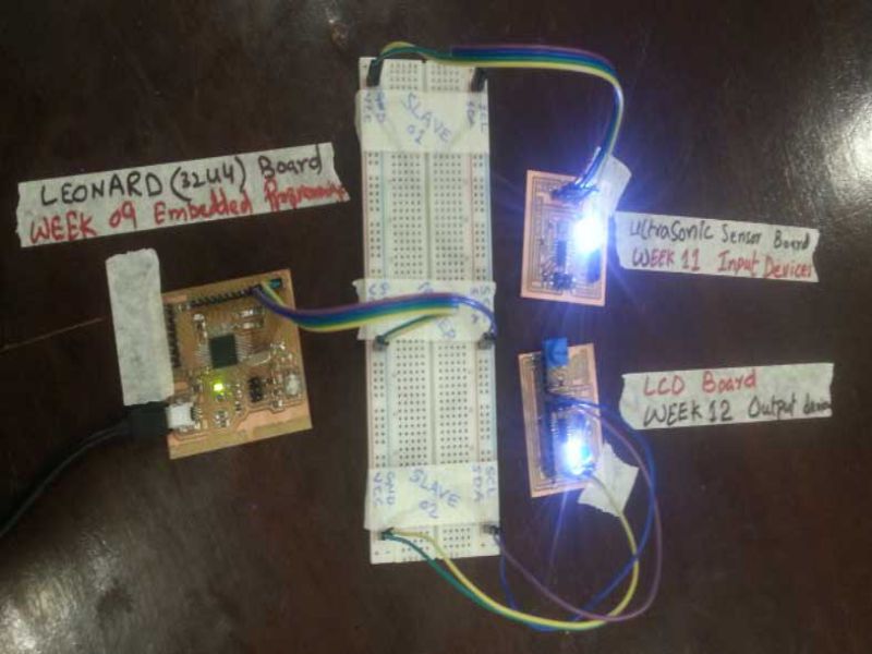 I used one board for Master and two boards for Slaves. For master device, I used my atmega32U4 (Arduino Leonardo) board which I designed in Week 09 Embedded programming. And, for Slaves (slave1 and slave2): For Slave1, I used my board of attiny44 which I designed for Week 11 Input Devices. For Slave2, I used my board of attiny44 which I designed for Week 12 Output Devices.