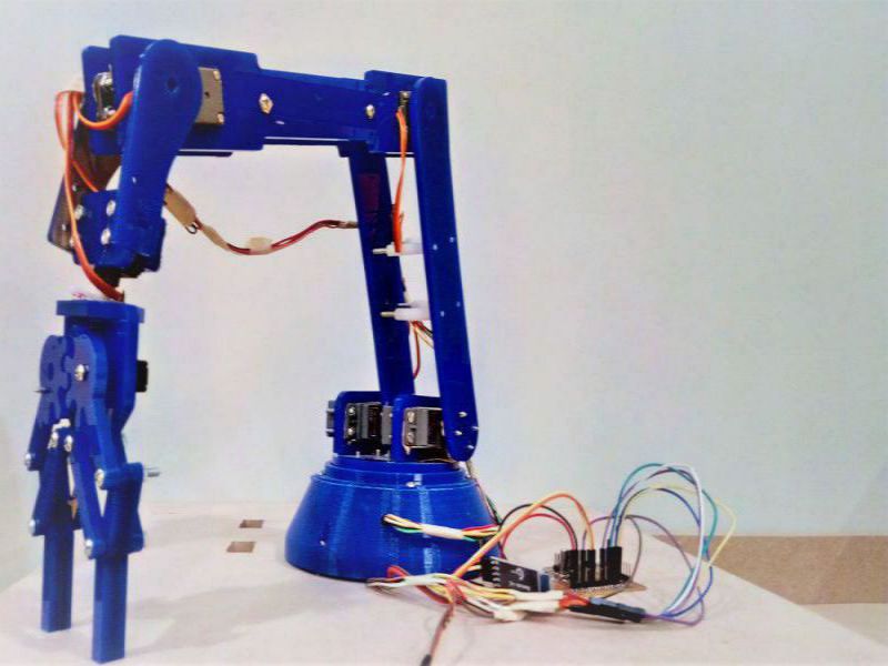 In all essential aspects a robotic arm resembles perfectly the human arm in appearance,structure and in many of its functions.A human arm can move freely in 7 axis, but now a days it's not a big deal to see robotic arms which have the same degrees of freedom. A typical robotic arm is made up of seven metal segments, joined by six joints. The computer controls the robot by rotating individual step motors connected to each joint (some larger arms use hydraulics or pneumatics) Your arm's job is to move your hand from place to place. Similarly, the robotic arm's job is to move an end effector from place to place. Designed and realized in the project, the robot arm has the ability to move in 5 axis directions with 7 servo motors.