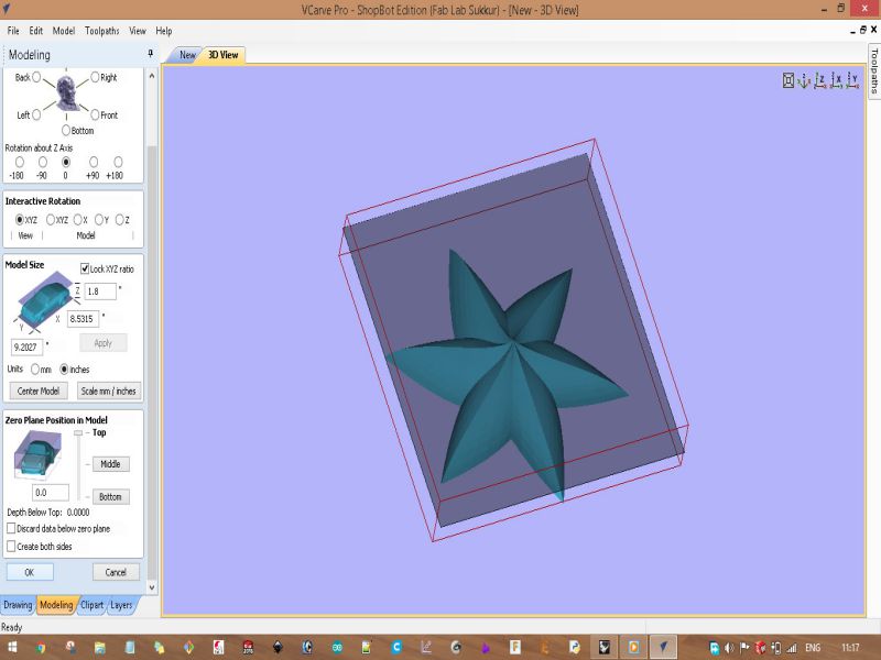 For making a test design we made a simple curvy shape in SolidWorks.The Curve was saved as .stl file and the tool path was generated in Vcarve. All the steps for making the composite are given below and also illustrated through pics. Initially, a new Vcare file was opened and the dimensions were set according to the size of the model (370 by 370mm).Then by importing the Component/ 3D model , the model is imported. Here we make some settings as described in the video attachd for individual assignment section.