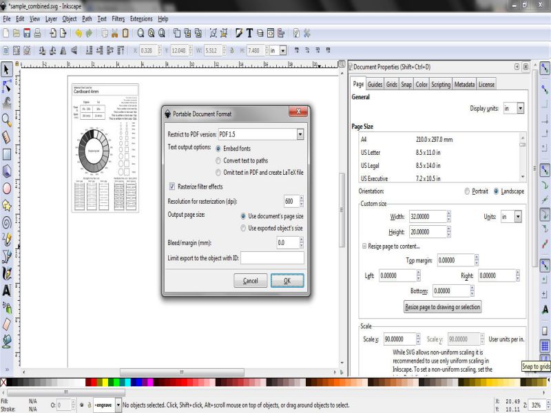 As per instructions we set cutting line strokes to 0.001 inches. Other vectors except 0.001 inches set to engrave with respect to their greyscale color. Then we convert our SVG file into PDF while setting page size to 32x20 inches from document properties and selecting 600 dpi as resolution for rasterization