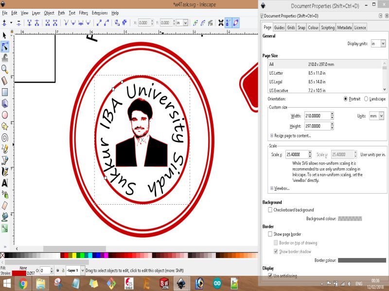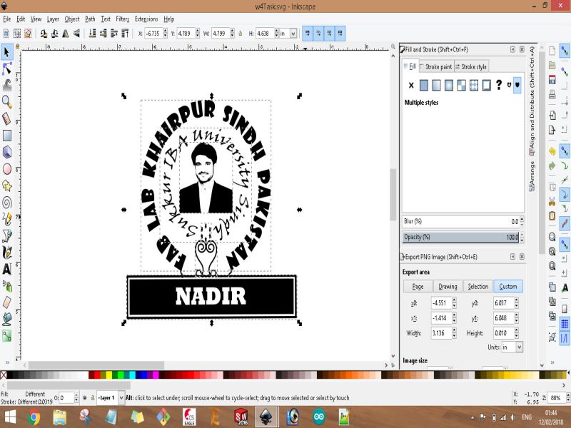 Steps of my designed project for Vinyl Cutter in InkScapeFor this task, I created a design combination of my image and texts. In beginning, I put my image then applied 'Bezier curve' function and 'edit path by node (F2)' function for removing the background of my image. After this I used 'Trace bitmap (Shift+Alt+B)' function to gray out the image. Now, I put my image in the circle and wrote text then used 'put on path' function to change texts as circle, again i repeat this for another layer of words then cut down the two circles. And, also played few other functions to beautify my design.