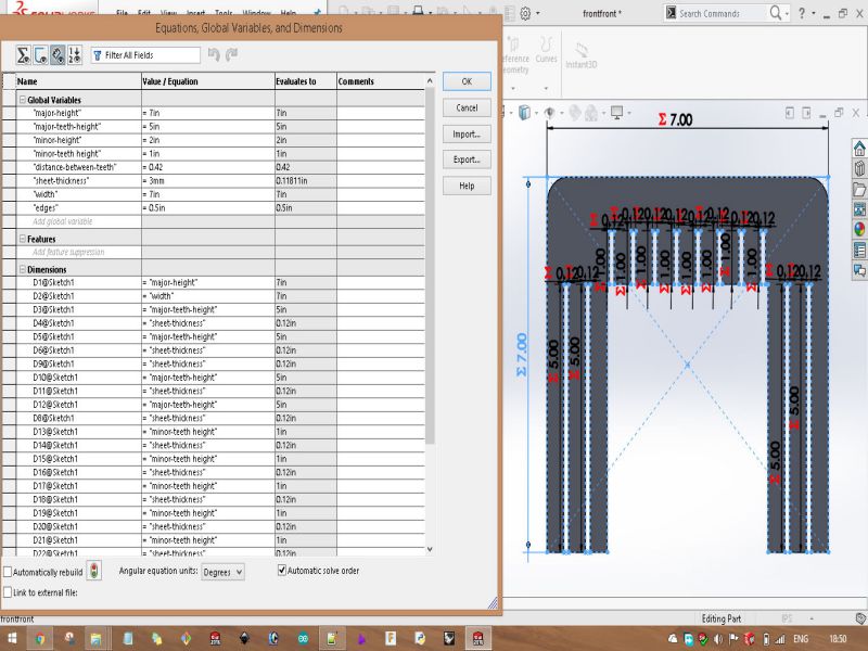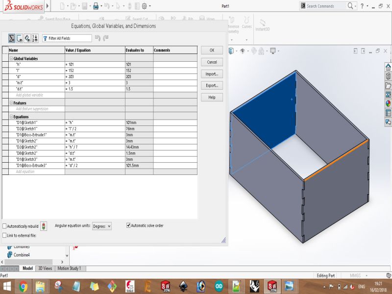 Parametric design reduces the problems which occurs when we think to change the design parameters. take the my example, I designed it in SolidWorks by setting "global variables" of the parameters of the design. I choose 3 mm (0.118 in), because I thought to laser cut it on plywood of 3mm thickness which is available in our lab. When I complete my whole design, then I recognized that we have few sheets of 3mm plywood in our lab, in other hand I saw that we have 4mm (0.157 in) cardboard in abundant quantity. So, I set my mind to laser cut my design on cardboard. Here design needs to change from 3mm of thickness to 4mm. What I did, I just went to "Equations" and change the thickness from 3mm to 4mm in "global variables". This way, every where the design changed its thickness, and where ever I used this parameter it changed accordingly.Learning outcomes and conclusion