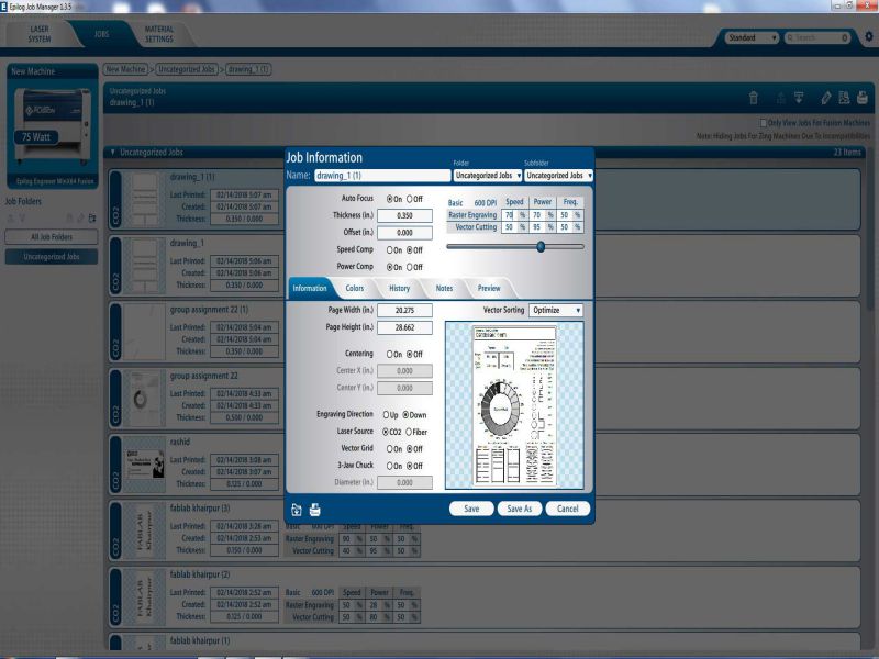 We select our job and check the preview by clicking on "preview".Select the location of job by dragging the image in preview menu and set where we need it on Laser machine bed, and click "Save"