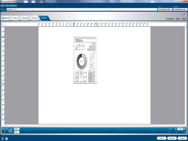Click on combined in "Job Type". We set Raster power to 100% and speed to 100%. and Cutting power to 30% and speed to 10%, after setting up parameters click "OK" and the job transfer to Epilog Job Manager.