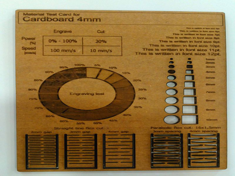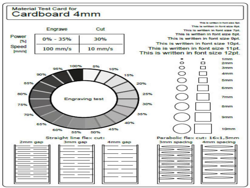 For group assignment, we are using a material test card which we found on Internet from Material Test Card for Laser Cutting and Engraving. This card is helpful to document the machine performance on any material. We are using 4mm cardboard to test machine parameters. In this test we are checking its engraving power, engraving performance on different font sizes, cutting accuracy by cutting different size shapes and, parabolic and straight line flexes by varying line spacing