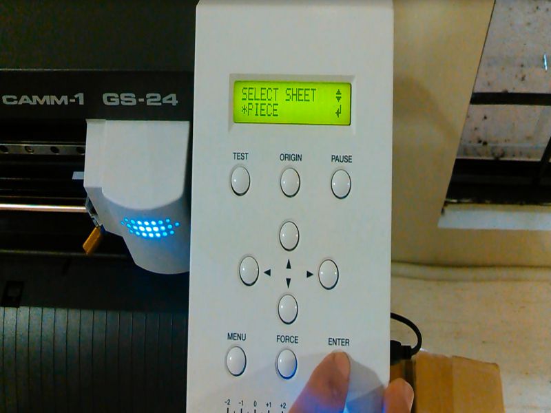 - Now, using operating interface of the vinyl cutter machine, select the sheet type (sheet or piece) then press 'ENTER' button. I used piece, because I set and fix a piece of vinyl sheet in it.