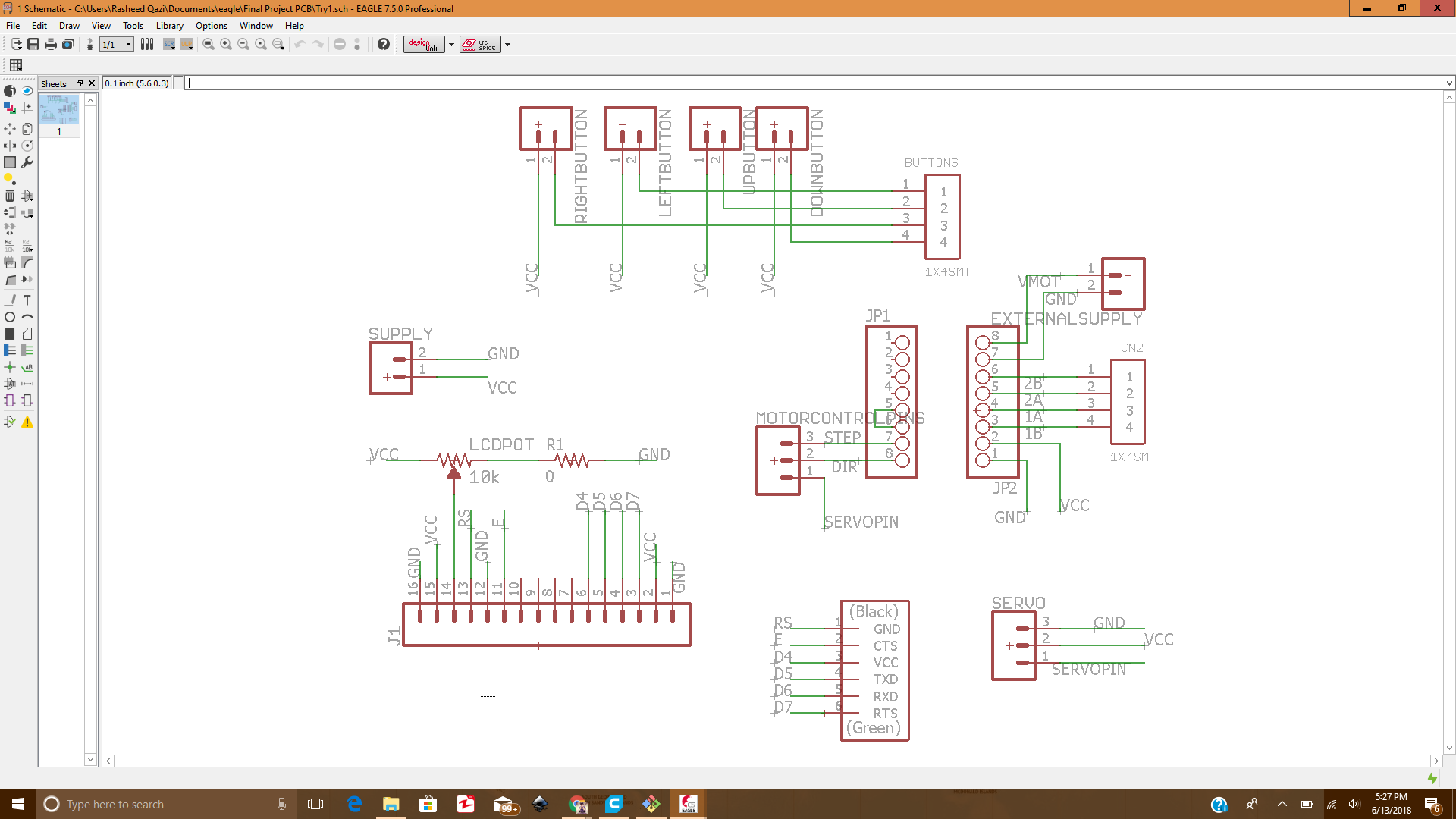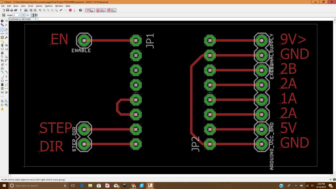 The main part of my project is to design the main PCB board for wire cutter to control the whole circuitry including input output and the other main parts like servo , stepper and the extruder. I searched for some PCB layouts then worked on the Eagle software to make the PCB. We have been making the bords since the very start, so it was not a dificult thing, but even then I had to be careful in designing the circuit. I had to keep following things in mind before designing the board.