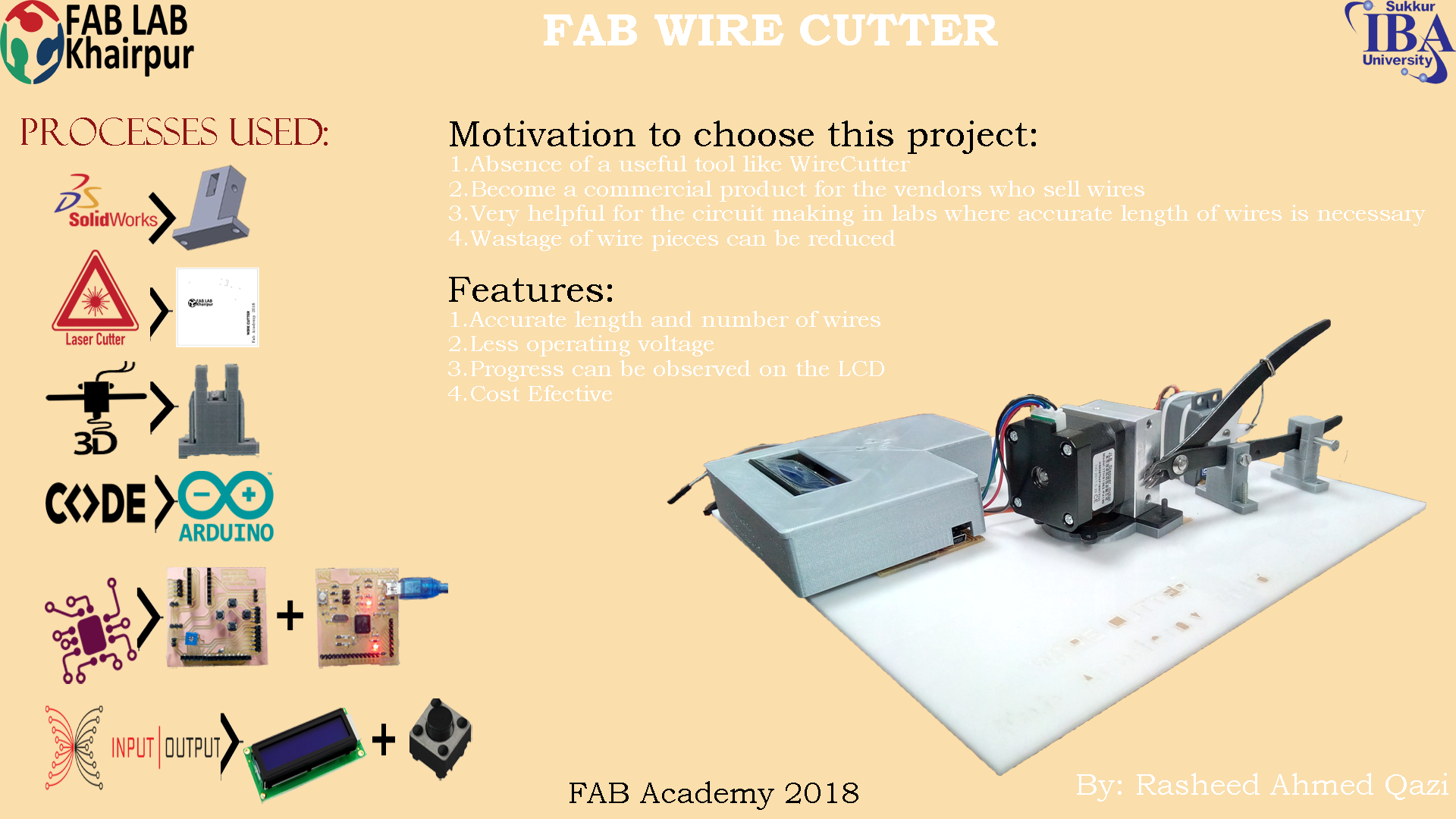 The Fab Wire Cutter was really an intresting project to do. While making this project I employed the already learned skills to make almost anything. The troubleshooting of different parts of circuit gave me a better insight about each component like Stepper motor driver IC, SErvo motor etc. The project will be used in our lab , and further improvement from the perspective of design and accuracy will be made.