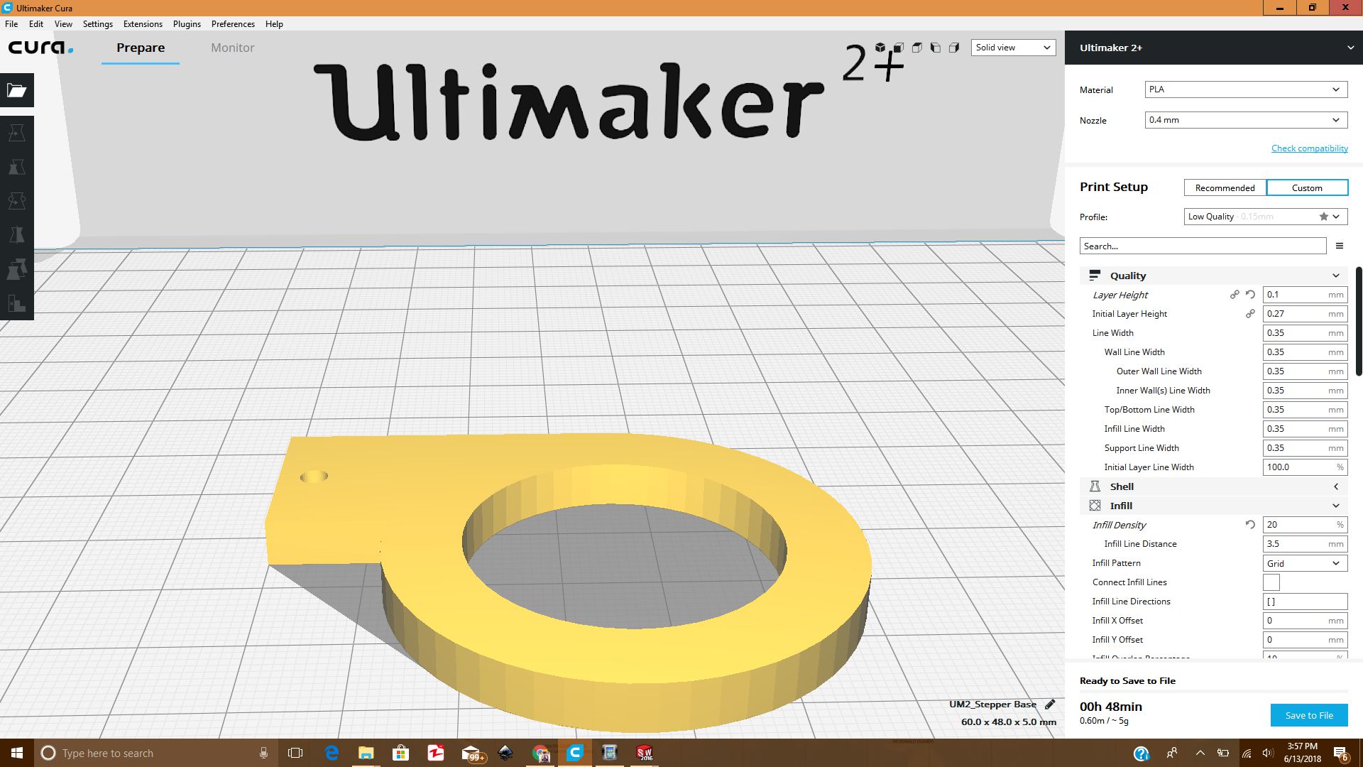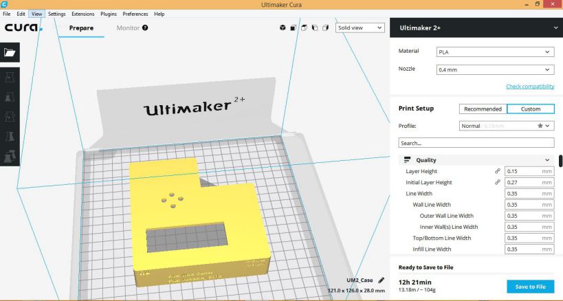 Now, it was the time to save the SLDPRT as STL, and then save its gcode in Ultimaker Cura as shown below: