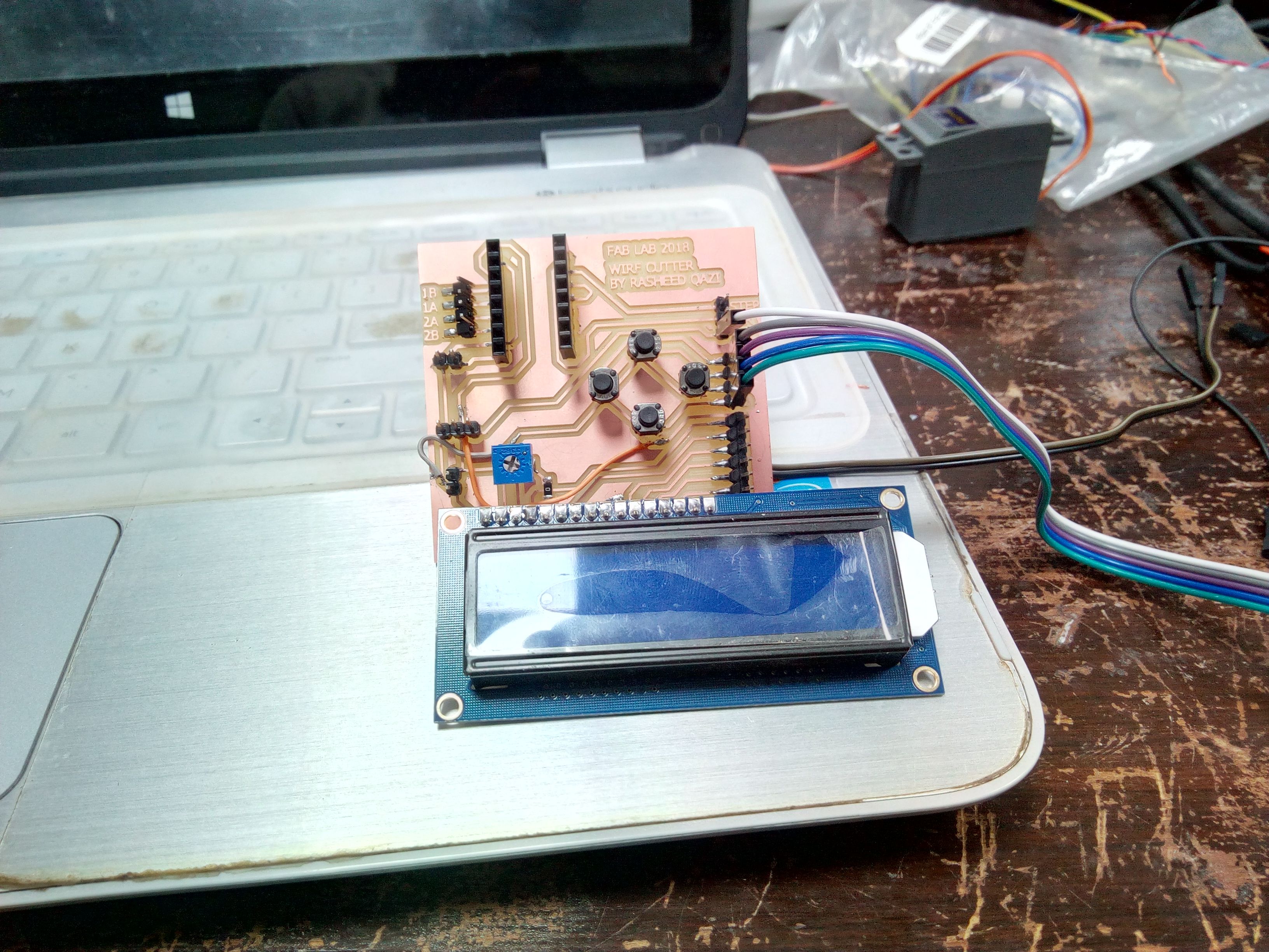 The wire cutter circuit with its input (push buttons) and output (lcd)