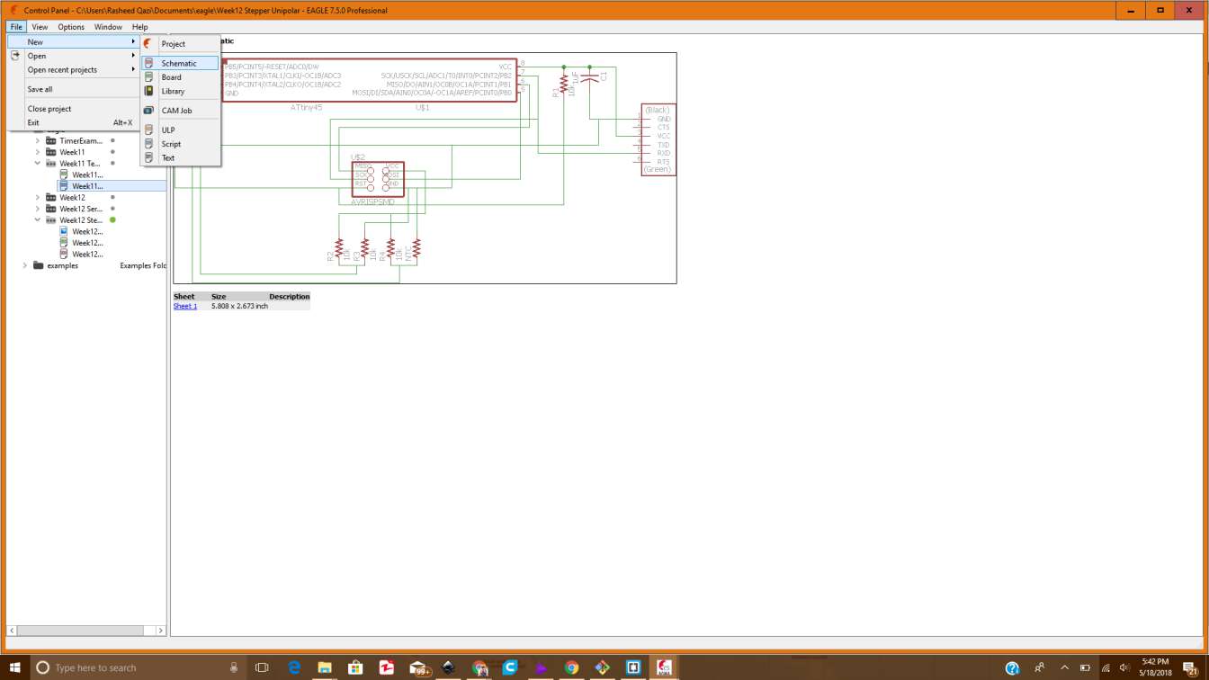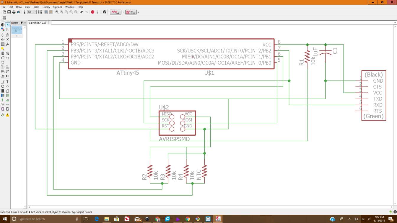 For completing the assignment of this week, I chose the circuit of Temperature Sensor. This circuit is using a NTC(Negative Temperature Coefficient) resistor placed in a formation of wheatstone bridge. We had the option to use the circuit traces availble in class schedule, but it was better to make it by myself and I did it accordingly.