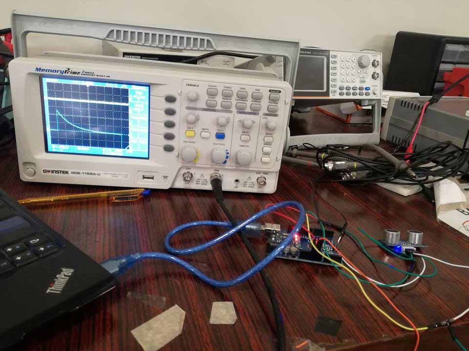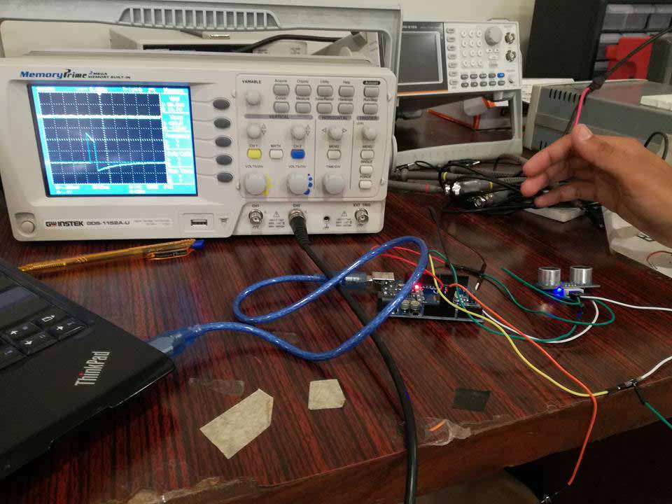 HC SR-04 Ultrasonic sensor is used by one of our group member in his individual task of this week. We detect the change in digital signal in Oscilloscope using arduino UNO. A sensor is connected with arduino and the pin of Echo is connected with Oscilloscope. Arduino is program to detect obstacle in front of Ultrasonic sensor (a code is attached with files), when an obstacle is present in front of Ultrasonic sensor we found change in wave in oscilloscope