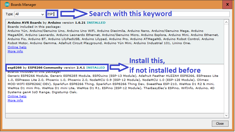 Go to the search bar of this window and write "ESP8266" to search that board, and install the board shown below:
