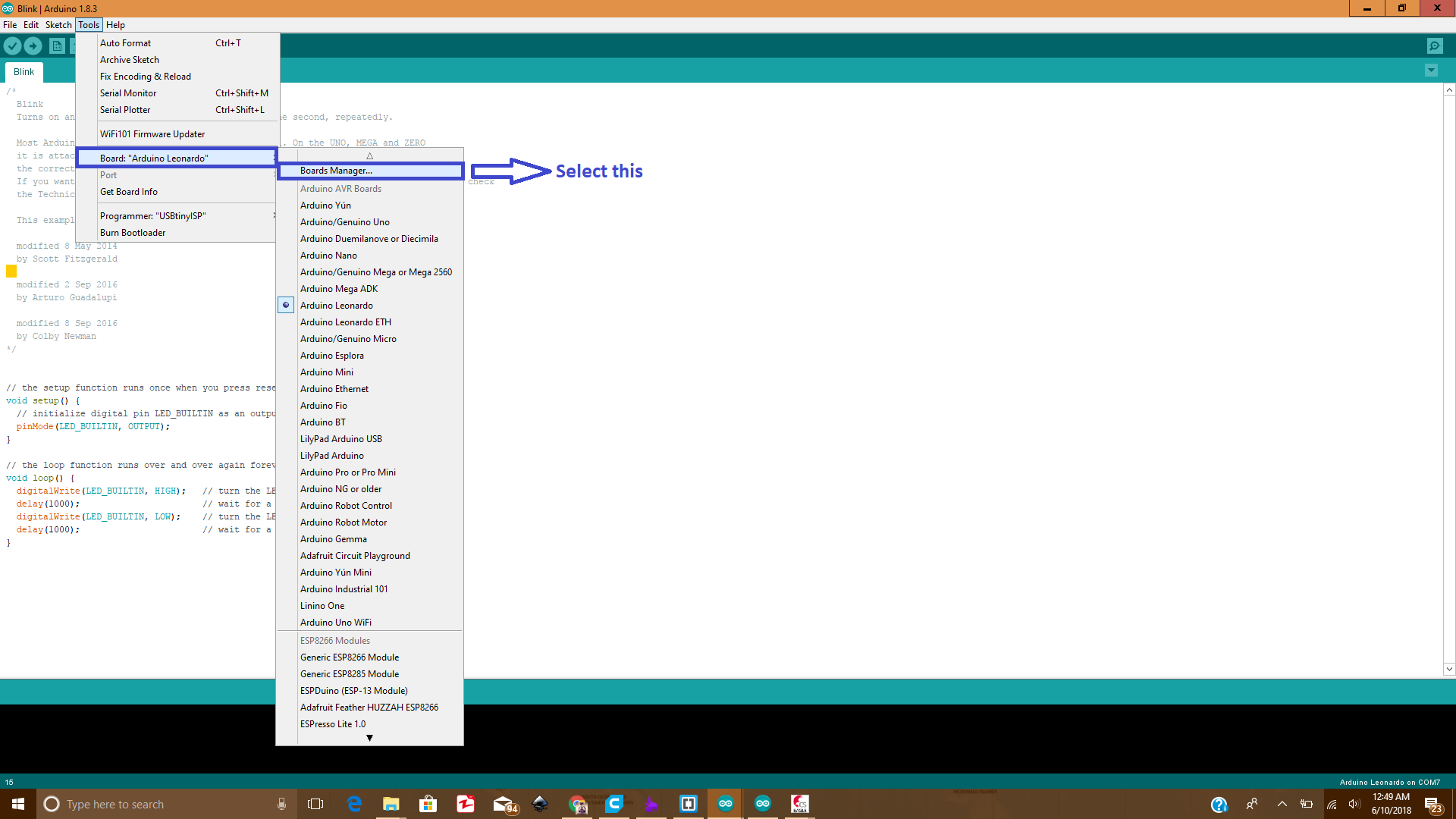 Now go to Tools>Boards>Boards Manager. A new window will appear