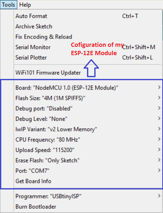 Once you have selected the board, then you can see the following configurations in the Tools menu. Make sure that these configurations are same if you are also using ESP-12E Module