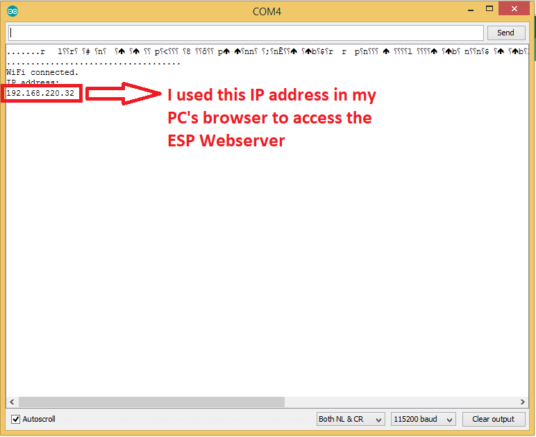 After the code is successfully uploaded, Open the Serial Monitor in the Arduino IDE. Press the RST button on the board and there will be a message at the serial monitor which shows the IP address through which you can access the Webserver created on the board.