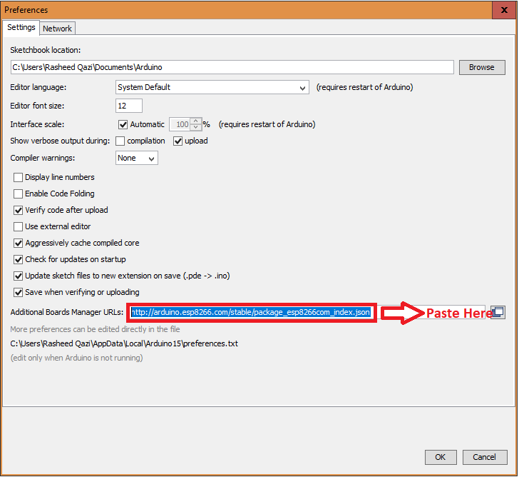 Then paste the URL "http://arduino.esp8266.com/stable/package_esp8266com_index.json", in the field named as Additional Board Manager URLs and press "Ok"