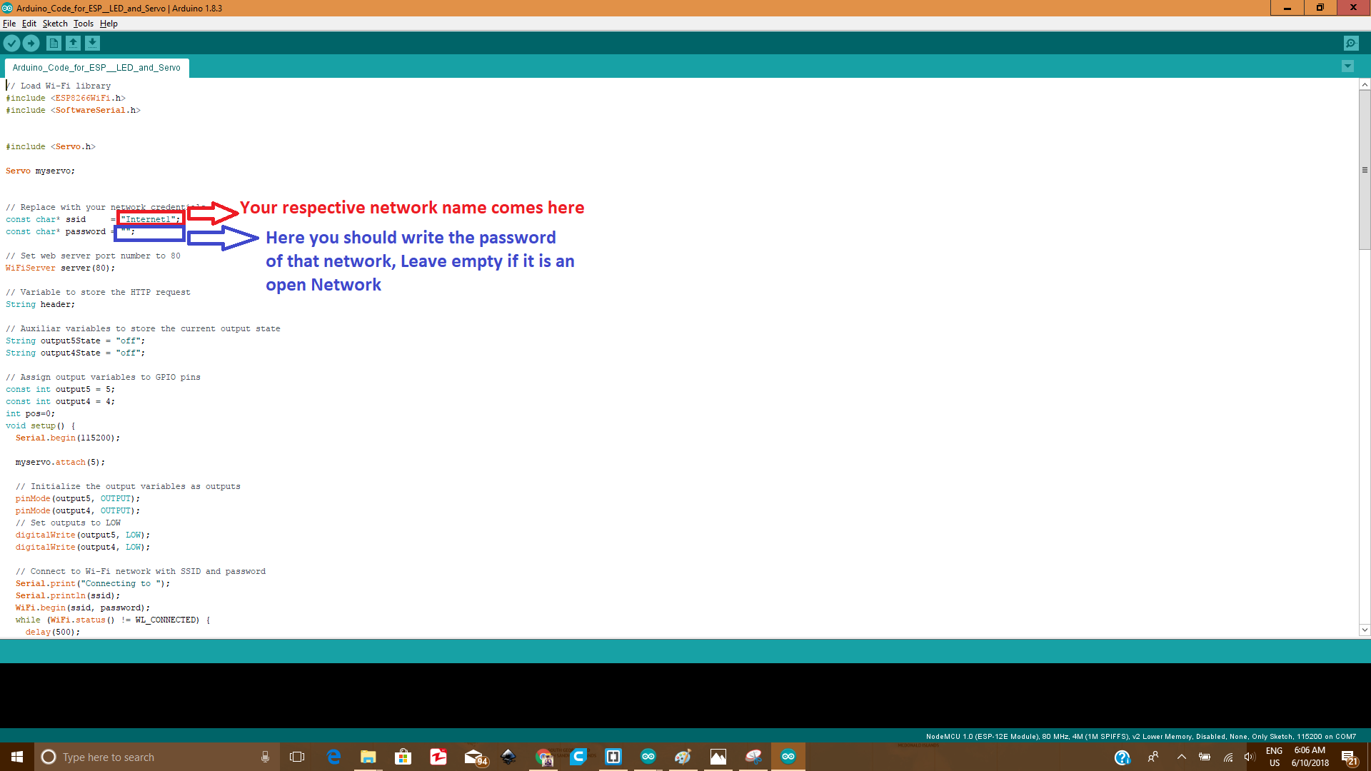 As I assigned the pins, now there was a little changing to be made in a code of making an ESP as a web server. This changing was to be done in the SSID & Password fields. We need to replace them with the respective network name and Password of the Wifi connection with which the respective devices (Mobiles/PCs) are connected. The fields in the code are shown below: