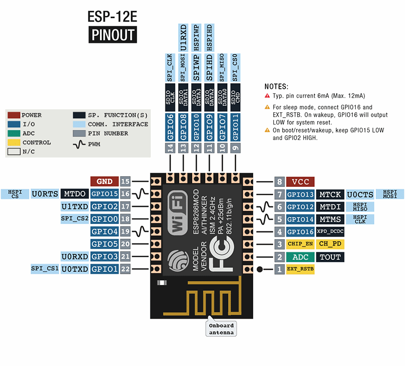 Now I was ready to upload the code to my ESP board, But inorder for the code to work properly, I must have assigned the correct I/O pin to the respective part of code as they are on my ESP device. In this regard, the pin configuration of ESP-12E can be very helpful. One picture like this which I found online is attached below:
