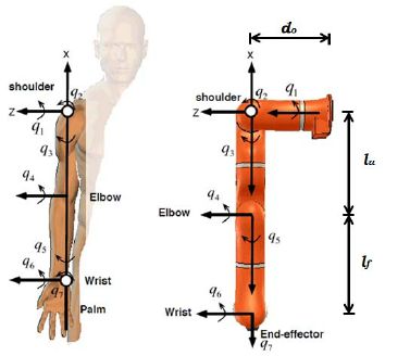 Roll, pitch and yaw are considered independent motions and therefore referred to as degrees of freedom. The second part of the human arm has two major joints with three degrees of freedom, two in the shoulder and one in the elbow. But the robot has a shoulder with one degree of freedom only, and thus the robot waist is introduced as a substitute for one of the shoulder’s independent motions. In the case of a human the waist has a different function, i.e., it is for manoeuvrability by counter-balancing the human body against the gravitational load in changing body postures. The counter balance in robots is some time used by incorporating a mechanical loop in its structure.