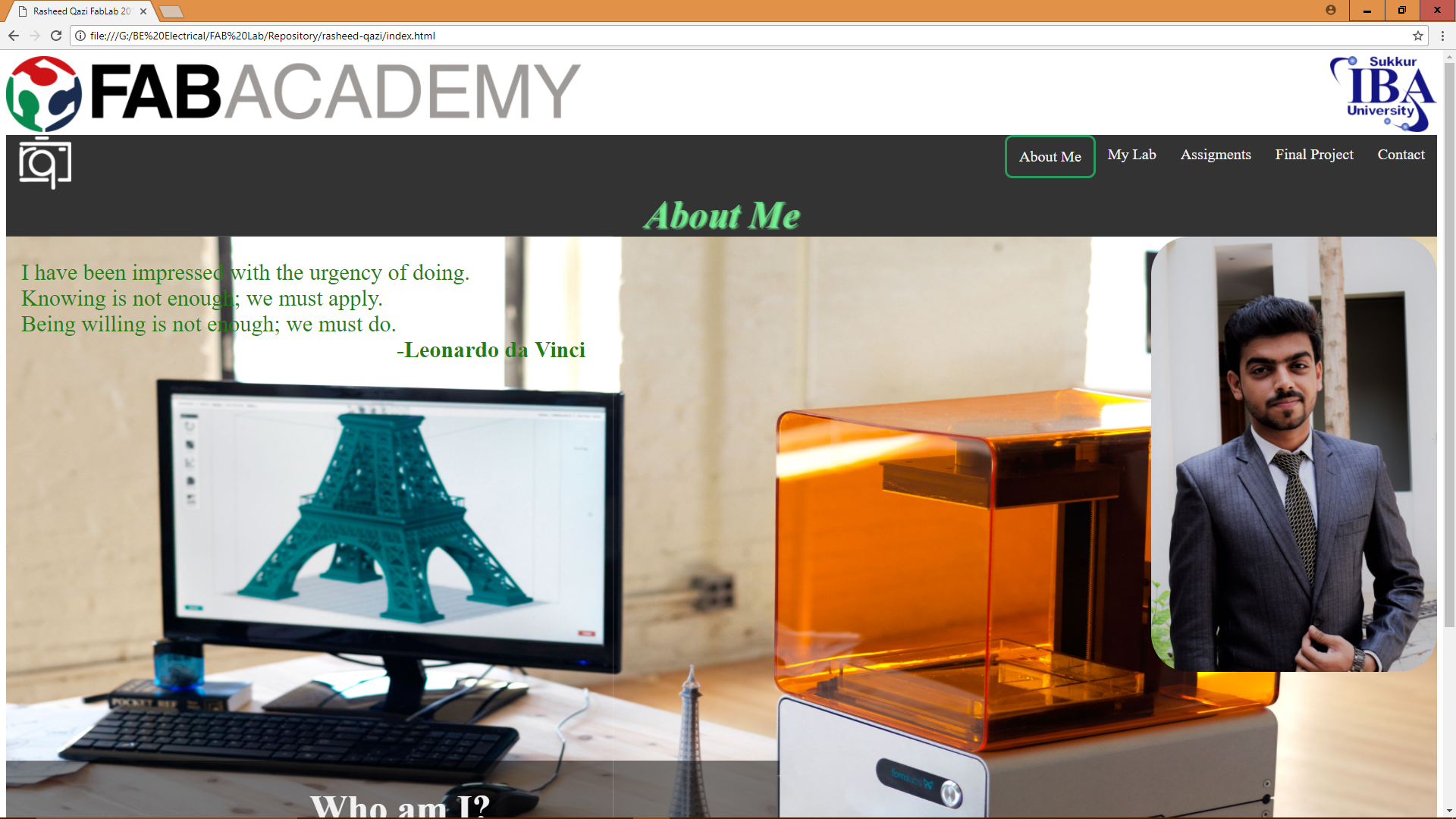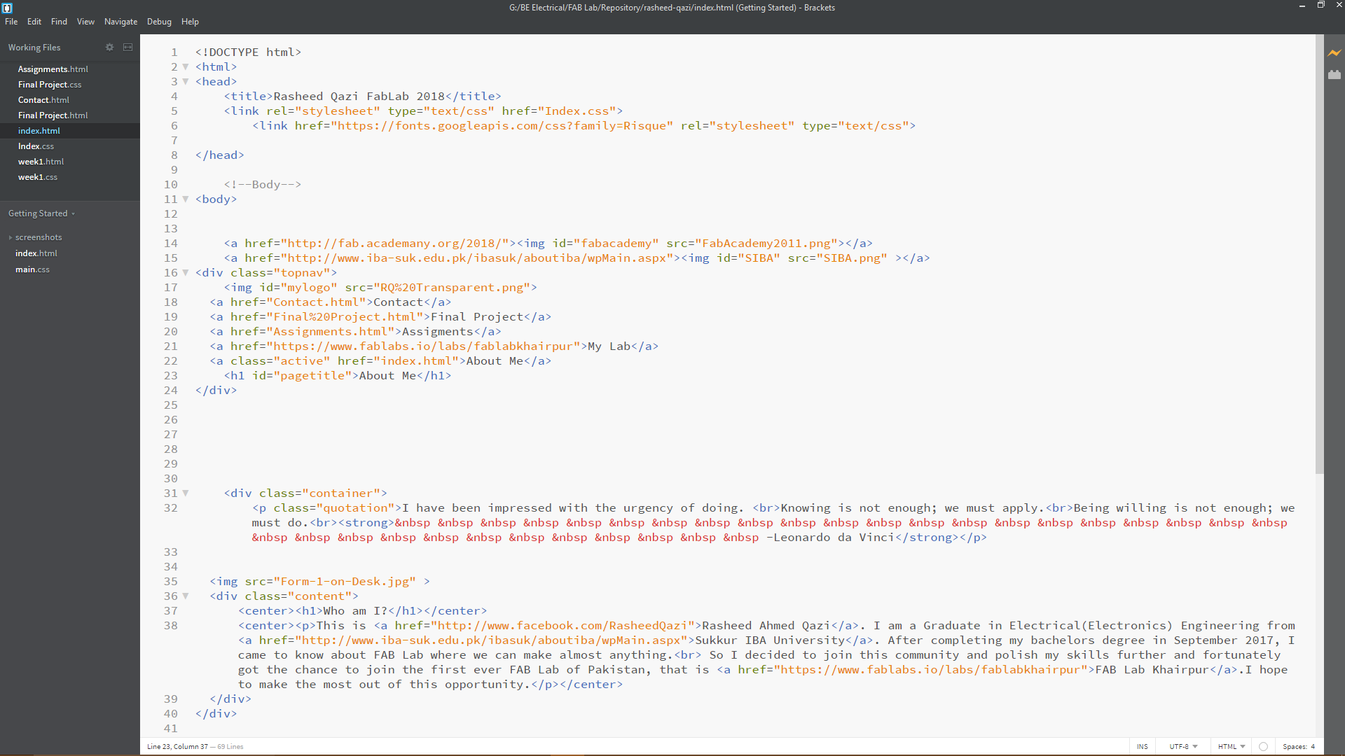 Initially I started working on Notepad++, but after watching the tutorials available at FabAcademy website i got to know about the Brackets Software that was very easy to use. Then a started to design the Homepage of my website, and from that i made other pages as well and linked them together as well.