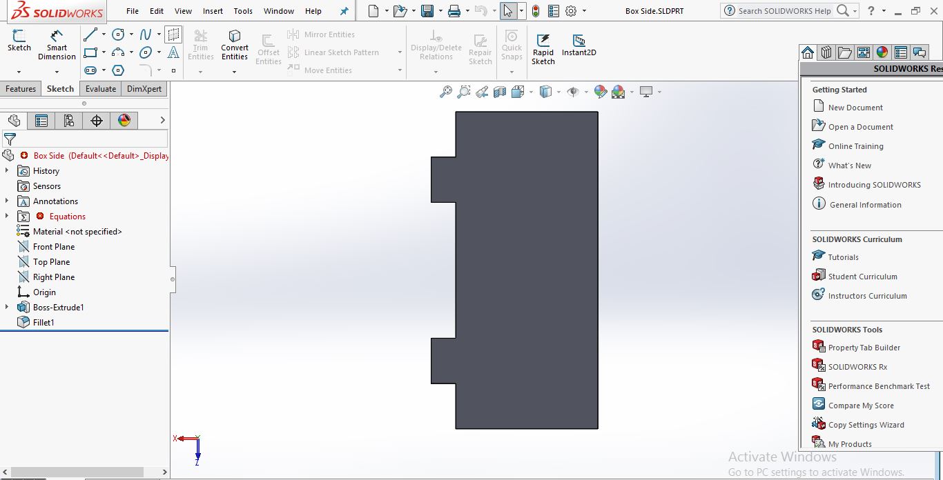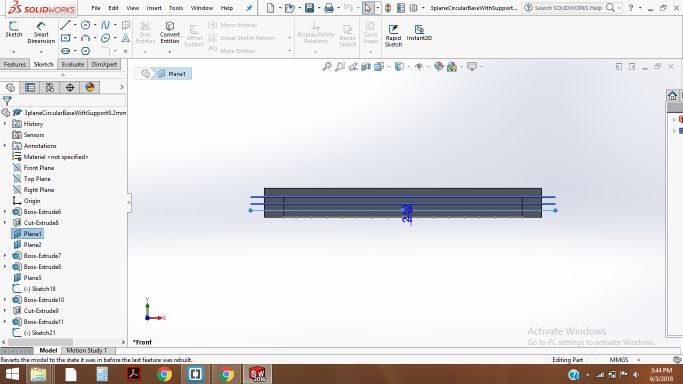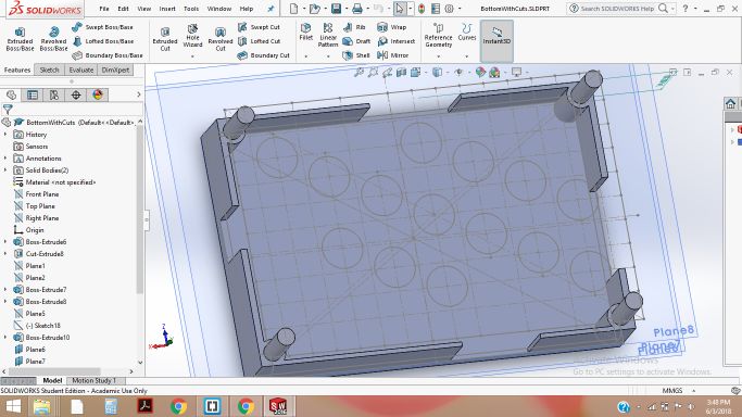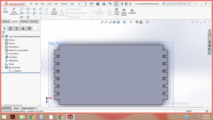 On the third plane, I made the rectangle of 5mm by 3mm , because my acrylic is of 3mm width, and I need to fix the acrlics on this plane.Using Extrude Cut again, I made the cuts.