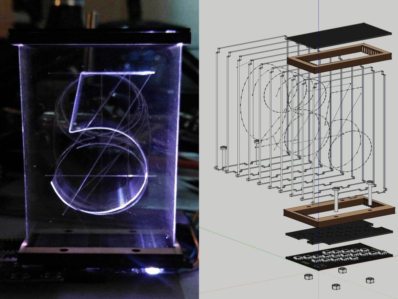 Below is the image showing a Single Number displayed on Lixie, and the internal structure of 10 acrylic sheets stacked together, PCB and footprints.
