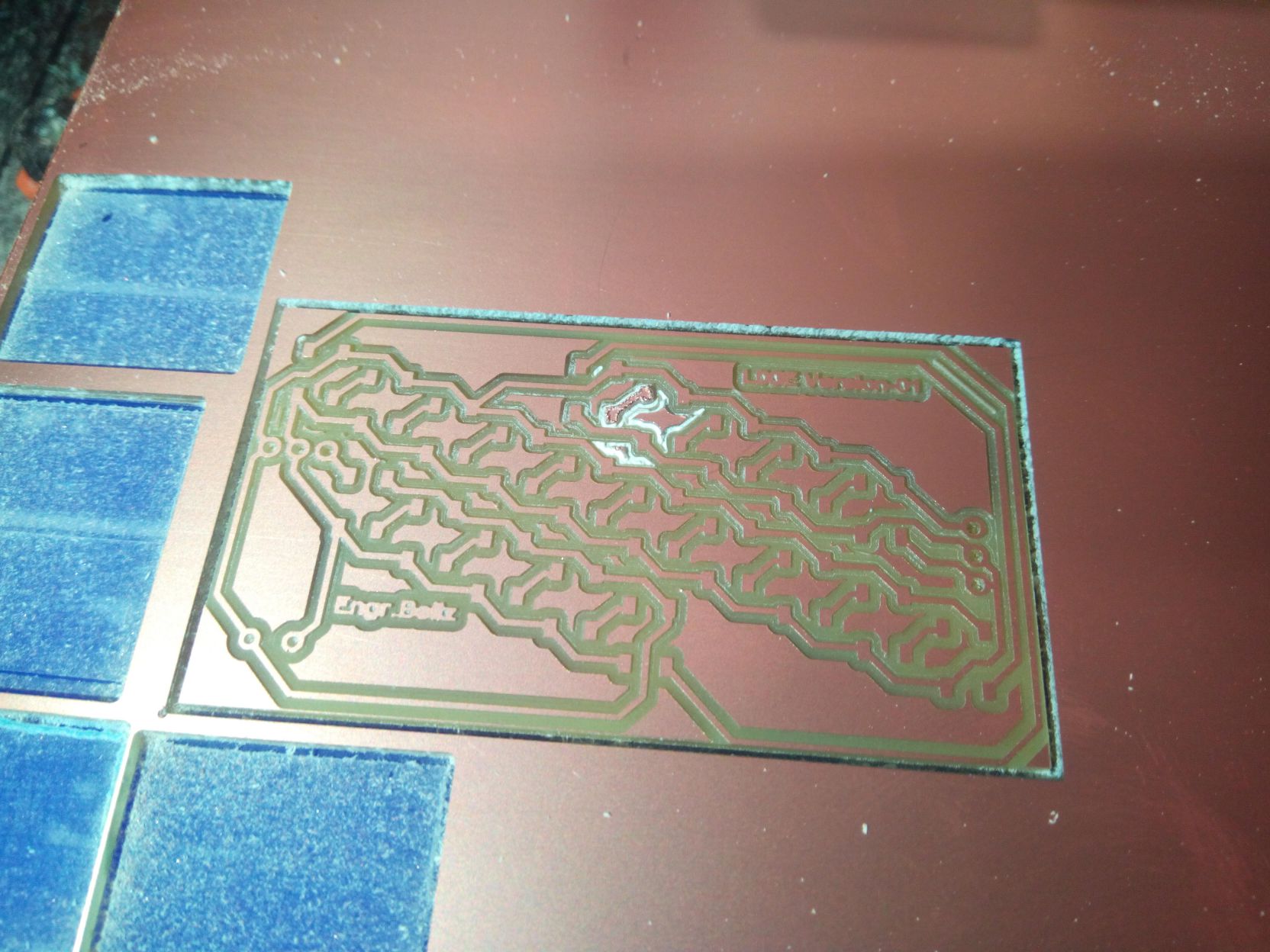 The next step is milling the board on Rolland SRM-20 milling machine, for traces we use 1/64 tool and for drills and outline, we use 1/32 tool size.