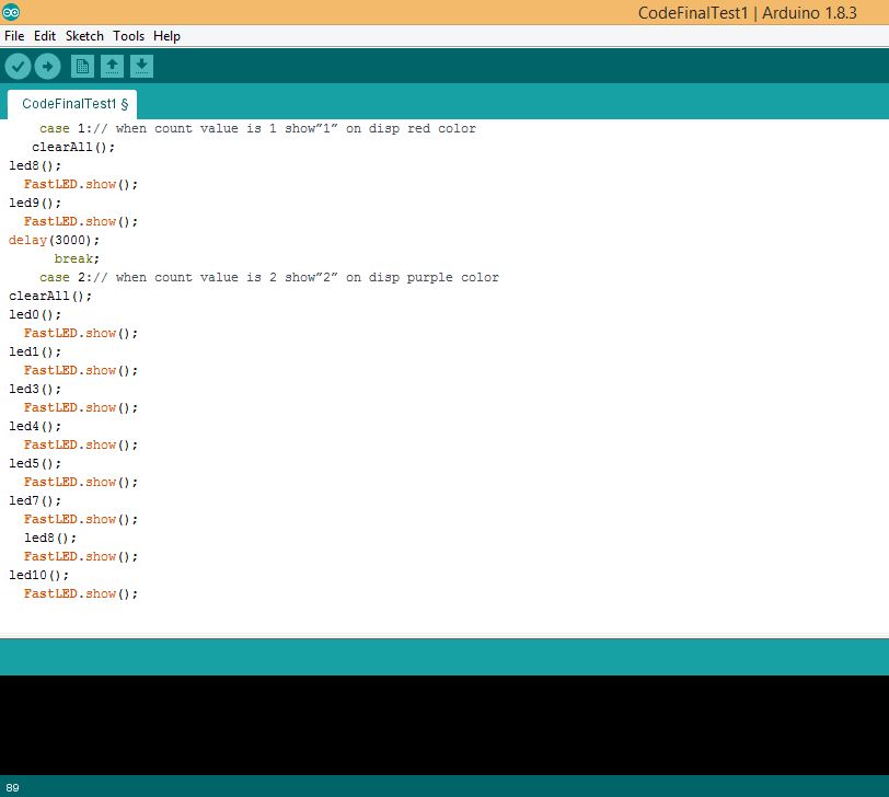 Then, I made a program to glow the numbers from 0 to 9 on the segments, just like we do with a counter.So, for this I used the same FastLed library , and put the code in a switch case. I made the sequence of Leds needed to be glowed for a partivular number. The full code is attached at the end of documentation.