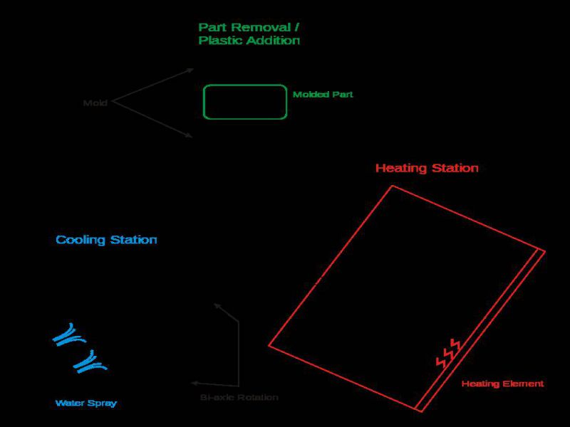 Rotational Molding involves a heated hollow mold which is filled with a charge or shot weight of material. It is then slowly rotated (usually around two perpendicular axes), causing the softened material to disperse and stick to the walls of the mold. In order to maintain even thickness throughout the part, the mold continues to rotate at all times during the heating phase and to avoid sagging or deformation also during the cooling phase.