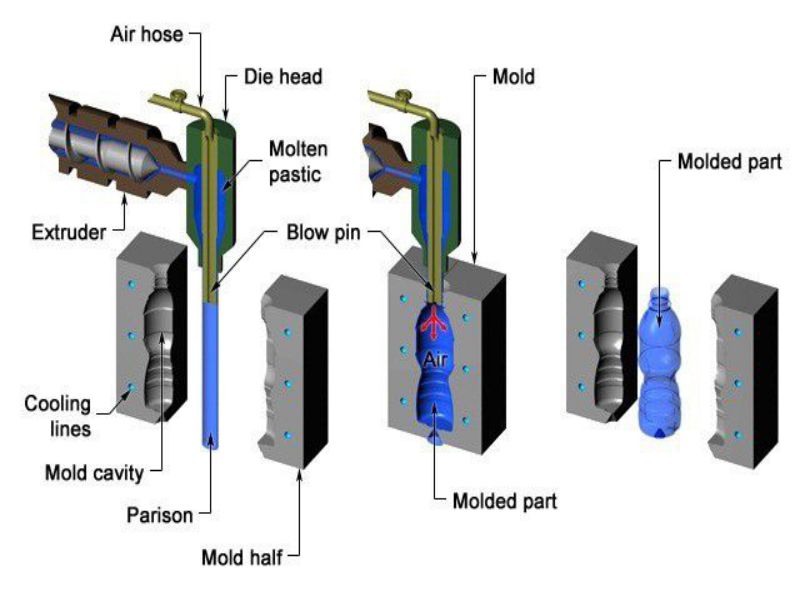 It is a manufacturing process to make hollow plastic parts.Blow molding is used to make pipping and bottles.The process is shown below: