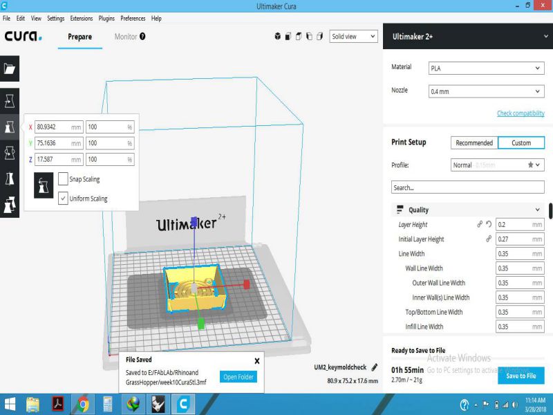 The file is then exported to stl and opened in Cura to check the dimensions.