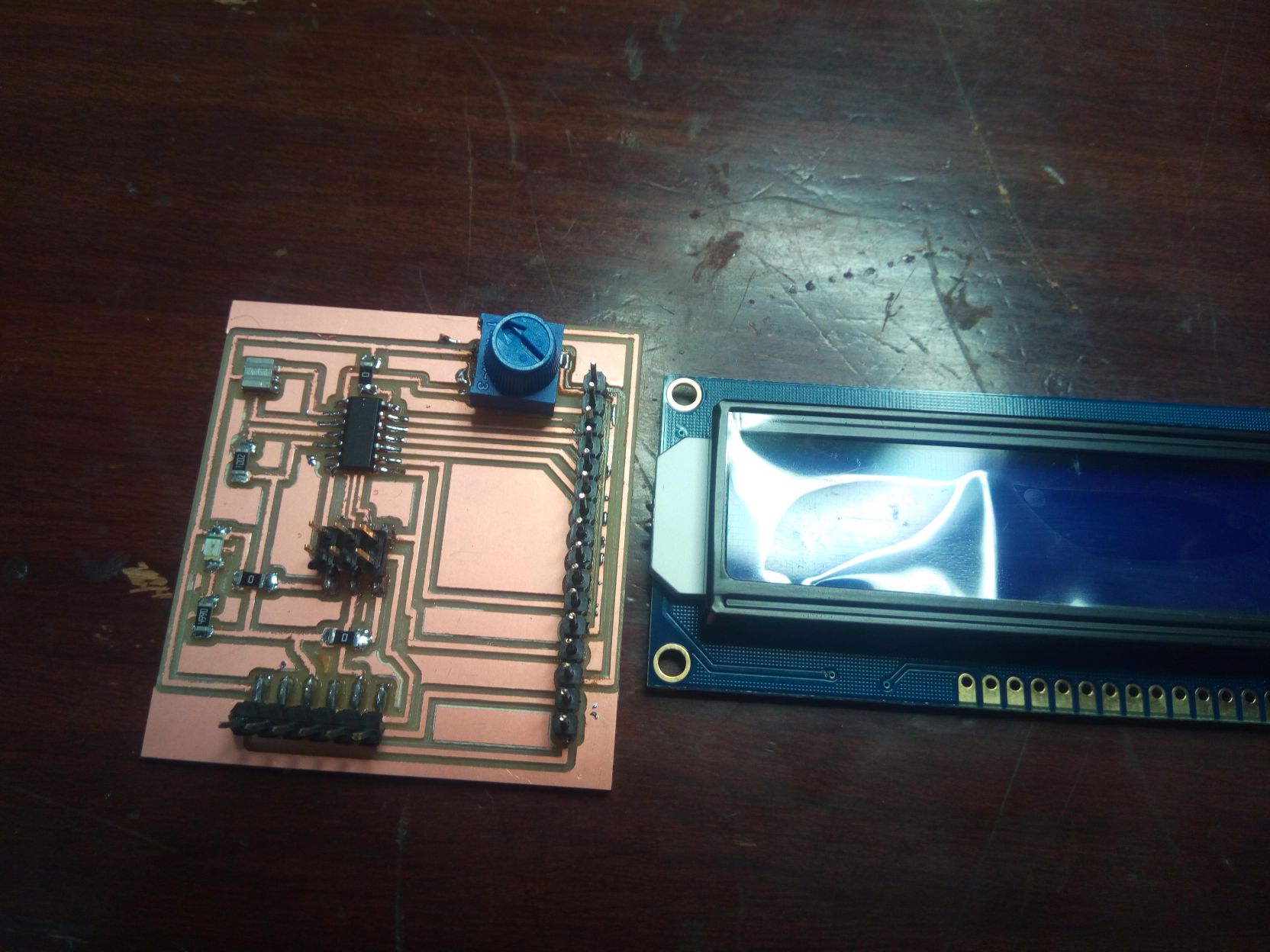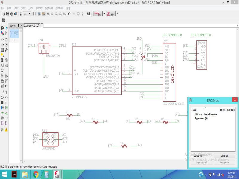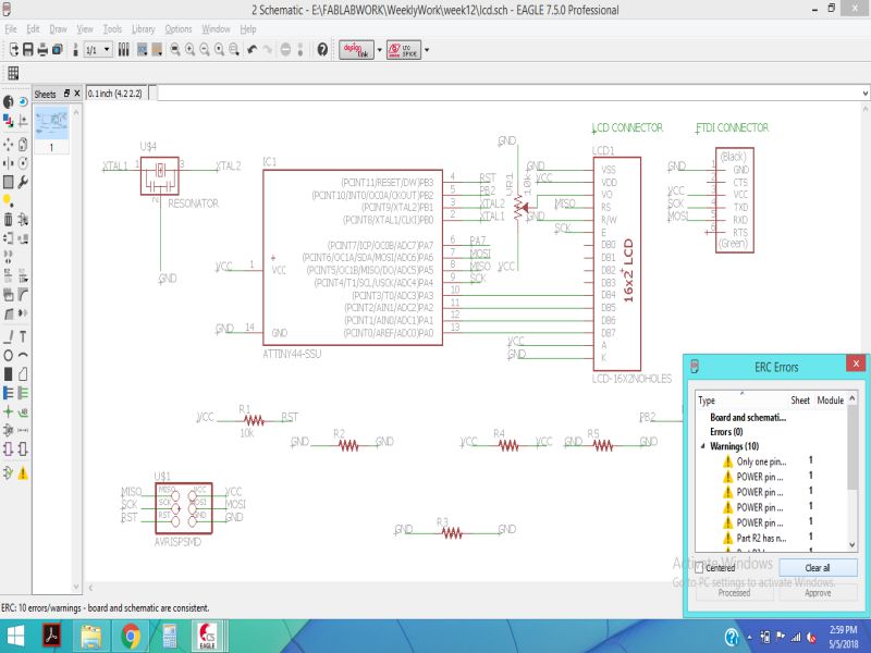 In order to redesign the circuit, I used Eagle software. The schematic is shown below, along with the board. Following image shows the pin configuration used to make the connection between ATtiny44 and LCD.
