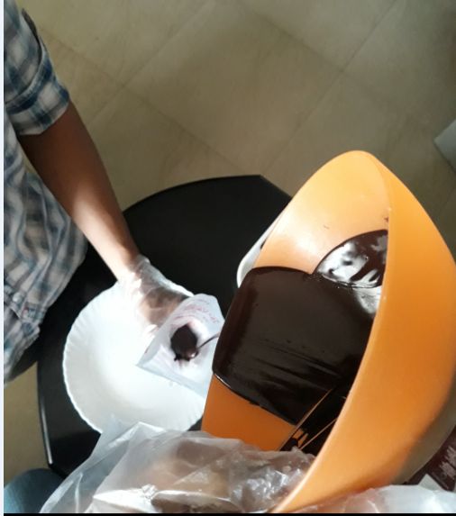 Unfortunately things were not working very well with the melting part. The apparatus we had were not of the right size. I was facing issues with mixing the chocolate with spoon and also the heat was not supplied uniformly. So i shifted to home and used Microwave to melt the chocolate.