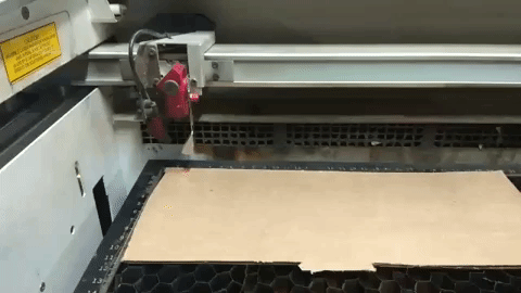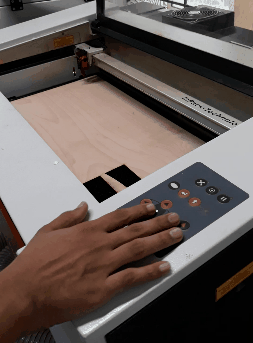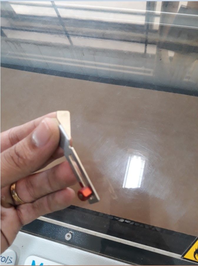 Before the cut is made the laser has to be focused For this there is a focusing tool available with the machine. This is placed on a small groove in the Laser and the bed is raised until it touches the tool. The tools drops from the groove when the bed touches it indicating that the laser is now focused. This step is important because if the Laser is not focused properly it may not make a precise cut or it may burn the workpiece. Once this is done, the lid is closed and the cut is made.
