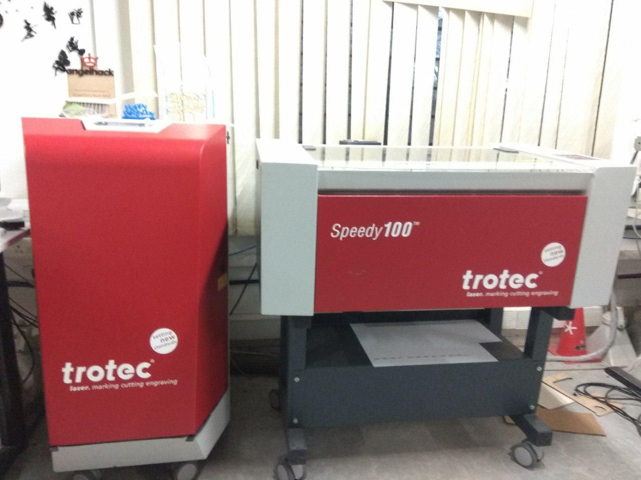 The machine we use in the lab is the TROTEC SPEEDY 100. A laser cutter works by focusing a high energy beam of light in a really small area to vaporize the material there. TROTEC SPEEDy 100 uses a Carbon Dioxide(CO2) laser. The laser beam is generated behind the machine and it is diverted by an arrangement of prims to focus the beam on the job. The beam moves through the set contours using CNC arrangements. The motion is only possible in 2D.
