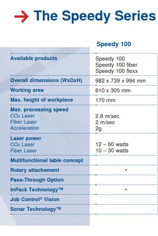 The Speedy laser engraving and cutting systems are the perfect choice both for entry level users as well as professional engravers. „Speedy“ – the fastest and most productive laser machines in the market: By processing at maximum speed of 3.55 m/sec and acceleration of 5g the Speedy is designed to increase your production efficiency. Thanks to the closed construction, essential components are protected from dirt and dust. This is why you can operate without virtually any maintenance and cleaning requirements. This results in higher up-time and lowest cost of ownership. All platform sizes from 610 x 305 mm up to 1000 x 610 mm are available with a CO₂, a fiber or even both laser sources in one laser system. The patented flexx function enables endless application possibilities. Use both laser sources in one job without having to change the laser source, the lenses or the focus manually