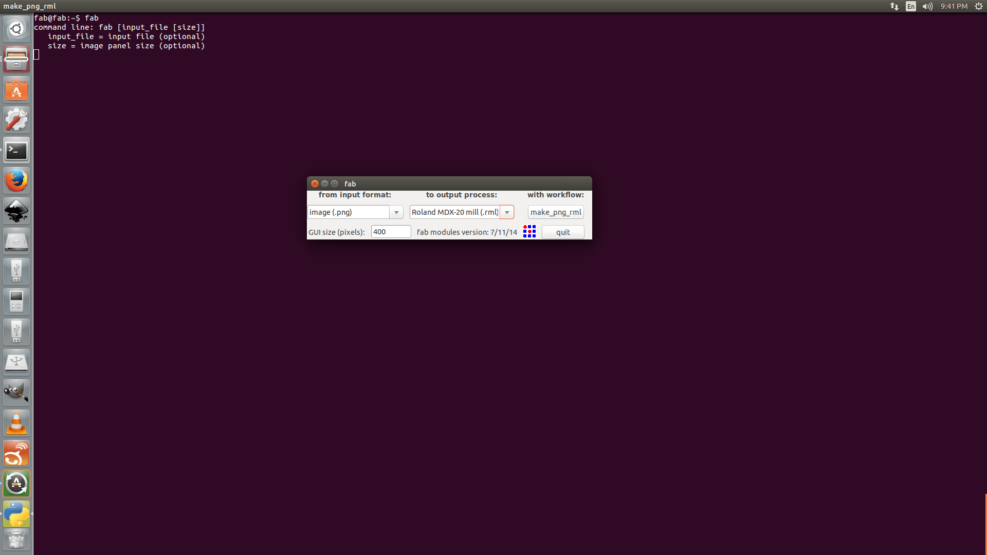 - Open Fab module using the command fab and select 'png' in the input format