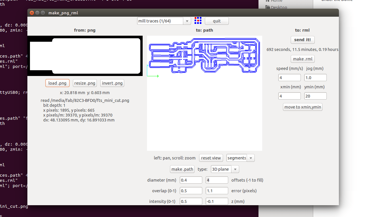 Select mill bit size as 1/64 from select box. Now click on make.rml