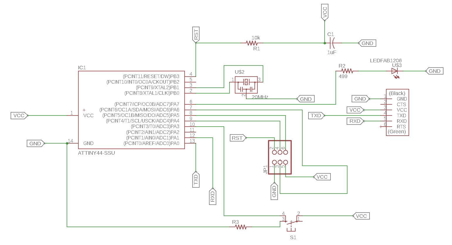 The echo hello board uses an ATtiny44 microchip. It's a 8-bit RISC based microcontroller. The Originla Design have only the UART Port and I added e a Programmable Button connected to pin PA3 with a Pull-down Resistor and LED connectd to PA7. A 20Mhz external resonator is also added.
